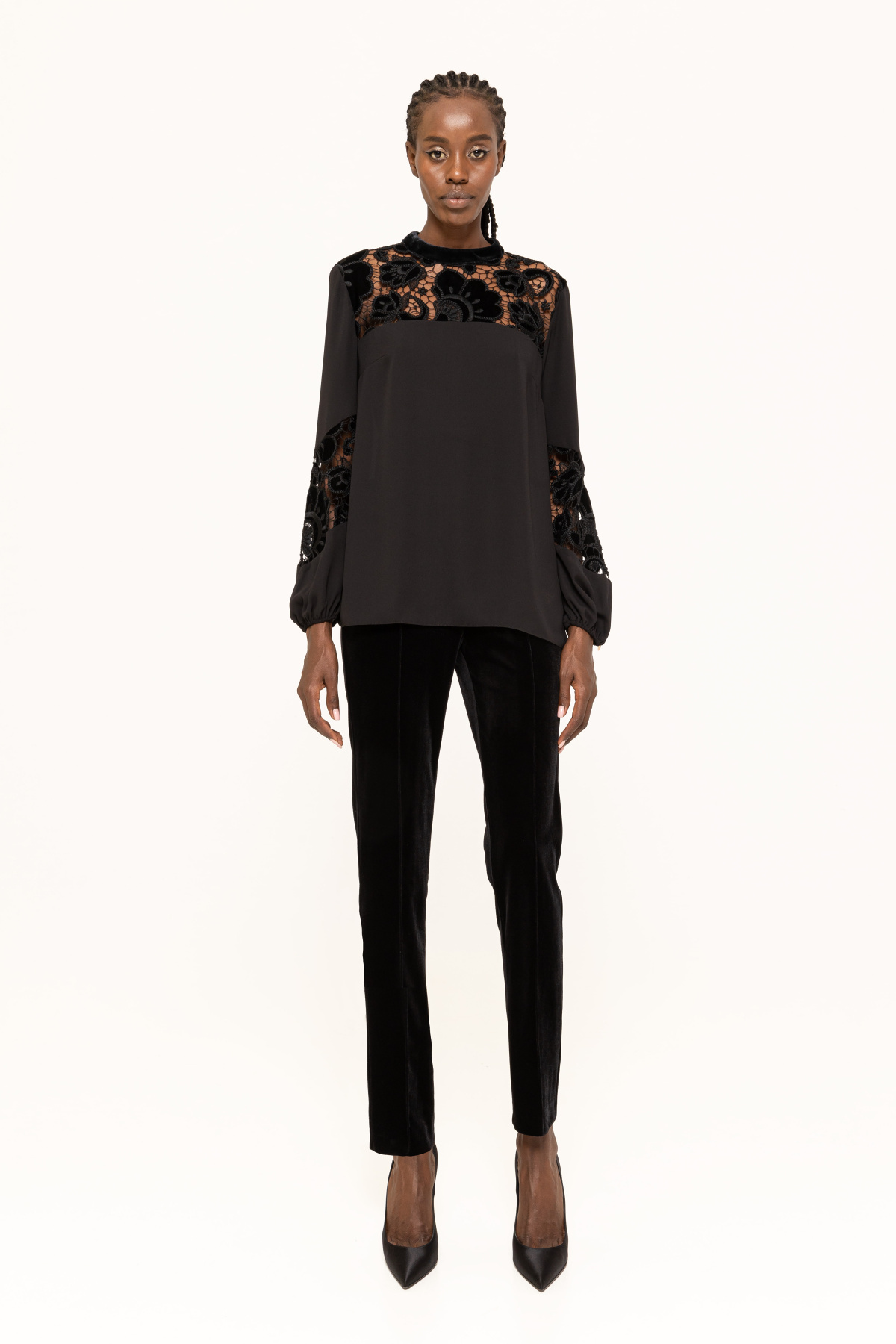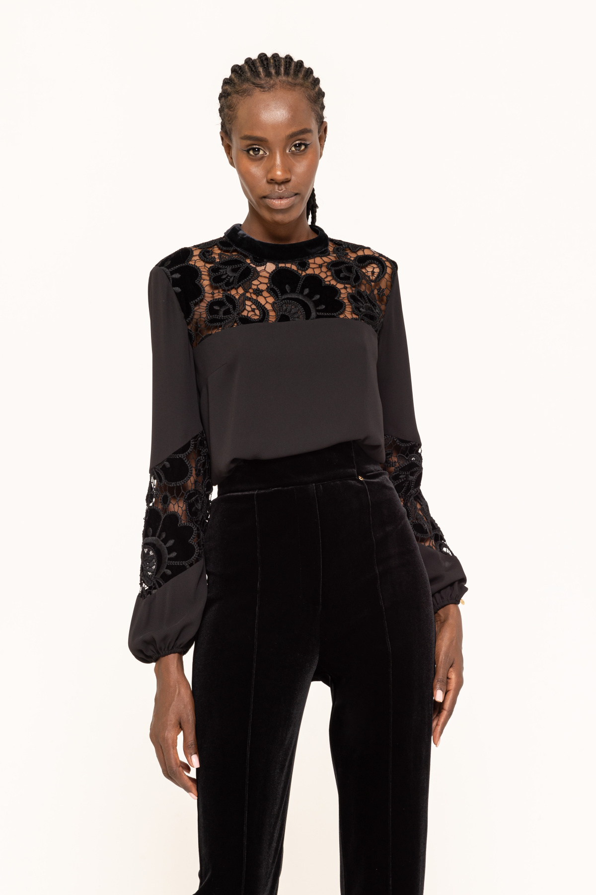 Роскошная блузка с вставкой из кружева с элементами бархата создает неповторимый образ, подчеркивая индивидуальность своей обладательницы. Идеально подходит как для повседневных образов, так и для особых случаев. Элегантное сочетание материалов добавляет женственности и шарма. В сочетании с джинсами, юбками или брюками станет незаменимым элементом гардероба. Подходит для работы, свидания или вечеринки. Подчеркните свою красоту этой изысканной блузкой!